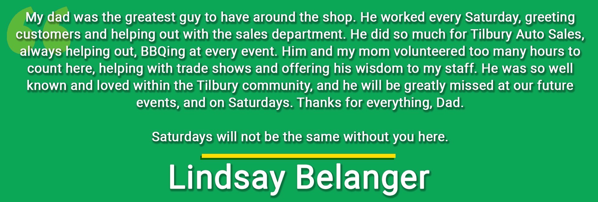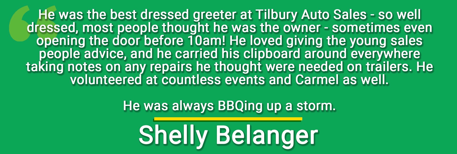 Paul will be greatly missed by a lifetime of dear friends North and South of the border. Paul was always self employed as a hairstylist and entrepreneur. He was an elected member of the Town of Tilbury Council for many years. Paul became a passionate golfer during his retirement years, enjoyed dancing, and cutting his grass. On weekends he enjoyed being the Saturday greeter at Tilbury Auto Sales and was beloved by the entire staff.